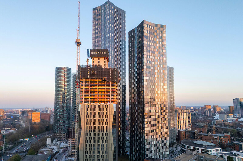 The city’s big private developers include Salboy, founded by BetFred owner Fred Done; The Peel Group; and Renaker, founded by Daren Whitaker, which built the complex of seven glass towers along Great Jackson Street. This includes the city’s tallest building, the 65-storey Deansgate Square South Tower, which with its bevelled sides resembles a giant blue Dentastix dog treat. None of the Great Jackson Street towers include any affordable housing, even though Renaker has received a total of £500m in loans from the Greater Manchester Combined Authority since 2015 to assist their construction.